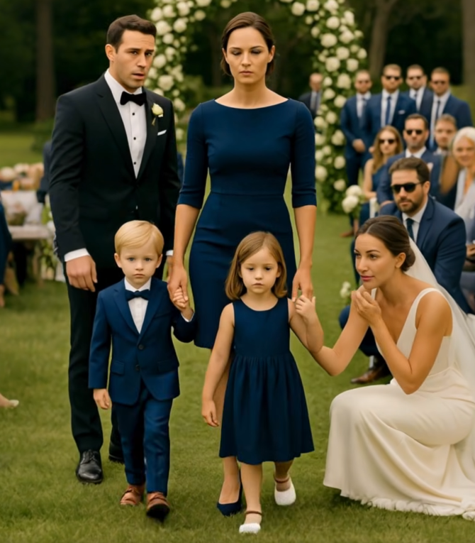 Lila entered quietly, wearing a navy-blue dress that elegantly hugged her figure. Her hair was neatly pulled back, and on either side of her were two children—one boy, one girl—both around six years old. Their faces were calm yet curious, their wide eyes observing everything with quiet wonder.