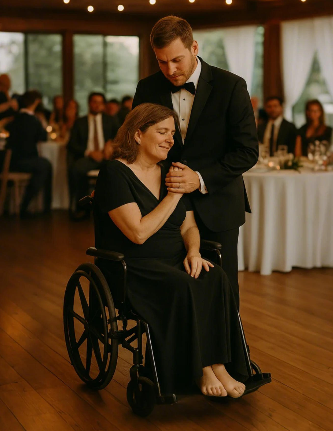 He moved slowly, deliberately, across the wooden dance floor in his black tux. My mom sat in the corner, dressed elegantly in a flowing black dress. She’d taken her shoes off—her feet always swelled at events—and her eyes were already shimmering with tears.