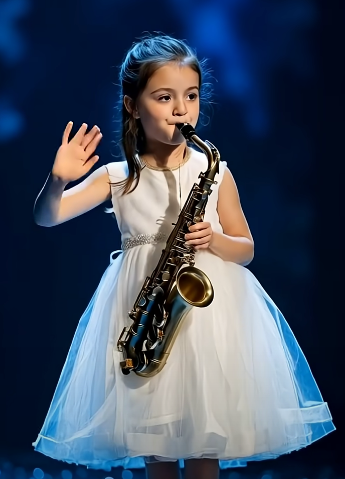 The lights dimmed across the vast auditorium, casting a quiet hush over the buzzing crowd. All eyes turned to the stage where a delicate silhouette appeared—a little girl no older than six, dressed in a snow-white dress that shimmered like starlight. Her hair was neatly tied back, and in her small hands, she held something unexpected: a saxophone nearly half her size.