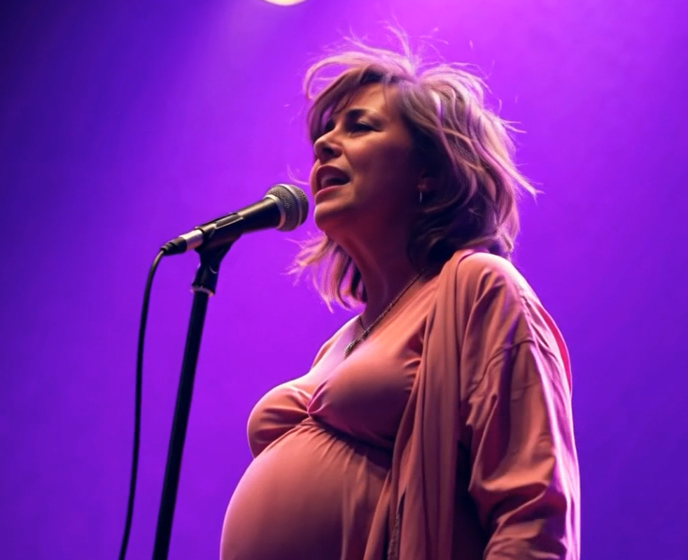 She stood still in the center of the stage. One hand cradling her belly. One holding the mic. A soft pink robe swayed gently against her body as the lights above cast a glow like moonlight.