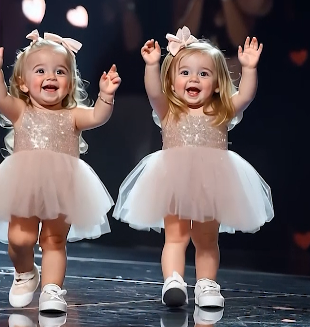 They wore soft pink tutu dresses, shimmering with sequins that seemed to dance with them. Ribbons adorned their curls, and tiny white shoes padded across the stage with uncontainable energy. The moment they appeared, the audience gasped—then melted.