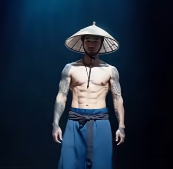 Under the glowing lights of the grand stage, a single figure stood motionless, wrapped in an aura of mystery and discipline. Wearing a traditional straw hat and simple blue garments, the performer carried the silent pride of an ancient warrior and the serenity of a monk who has conquered his inner storms. The audience fell into complete silence, sensing that they were about to witness something far beyond an ordinary performance.