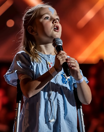 She was tiny—almost swallowed by the stage. A blue hospital gown draped over her small frame, and crutches held her upright where her legs could not. Electrodes were taped to her chest, a silent testimony to the battles she was fighting inside. Her head was wrapped with a small dressing, her wrists adorned not with bracelets, but with medical tags.