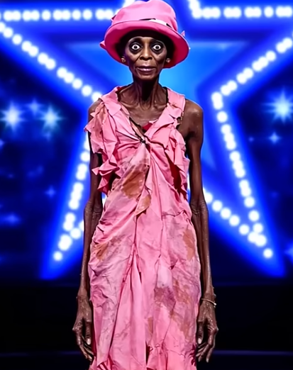 When the old woman stepped onto the America’s Got Talent stage, silence fell. She was frail, her bones showing through her thin frame, yet she wore a bright pink dress that looked torn and worn, as though it carried decades of stories. On her head sat a hat of the same color, tilted slightly to one side. But it wasn’t her outfit that struck the audience first—it was her eyes. Wide, intense, and unblinking, they seemed to pierce right through every soul in the room.