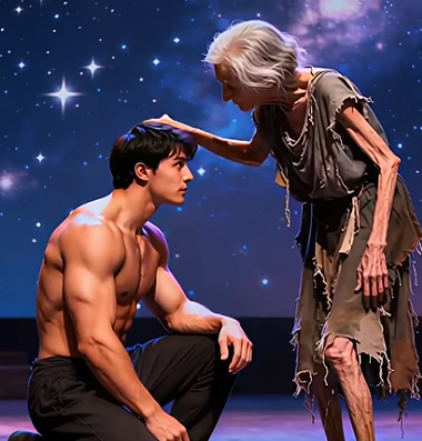 Then, from the opposite side of the stage, a young man appeared. He was strong and graceful, every step measured, his presence commanding. The contrast between them was striking—she, fragile and wrinkled with time; he, powerful and radiant with youth.