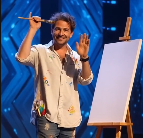 He walked onto the stage with quiet confidence, a brush in one hand and a spark in his eyes. Dressed in a shirt speckled with paint—memories of the walls and sidewalks he had already transformed—he stood beside a blank canvas, not just as an artist, but as a storyteller about to speak in color.