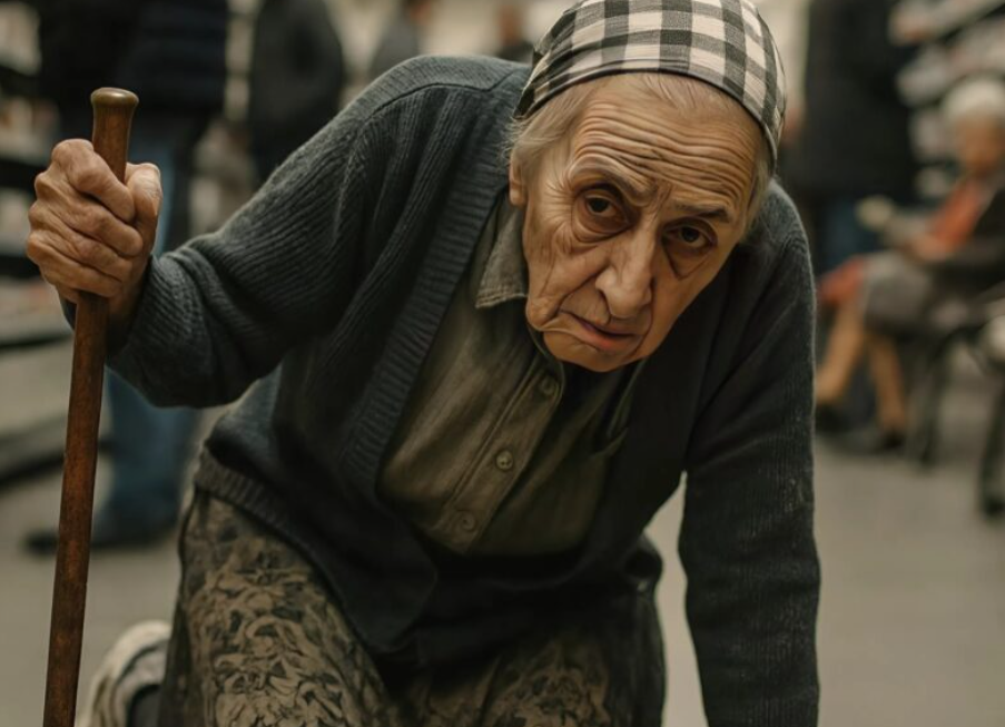 Breathing heavily, the grandmother crawled toward the exit. One hand held the cane, the other pressed against the cold tile floor. The store noise seemed to fade — only her heavy breathing and soft groans of pain could be heard. Every movement was torture, but she kept moving forward, hoping to leave the store and somehow make it home.