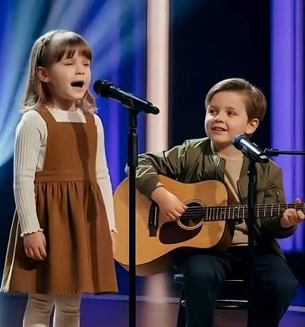 She stood tall for such a little girl, hands curled softly at her sides, wearing her simple brown dress and white long sleeves like something out of an old childhood memory. Beside her, her older brother sat with his guitar resting on his knee, giving her the kind of smile that said, “I’m right here… you can do this.” To the audience, they looked adorable — sweet, innocent, charming. But when she closed her eyes and began to sing, her tiny voice trembling with emotion, everyone felt a depth no child should ever know.