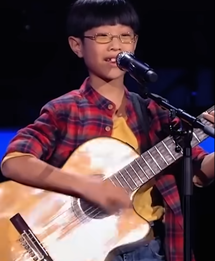 He stepped into the spotlight wearing a simple plaid shirt and round glasses, gripping a guitar nearly half the size of his entire body. At first glance, he looked shy — almost fragile — a boy who might whisper instead of sing, a child who seemed more comfortable tucked away in a quiet corner than standing before thousands. But when he closed his eyes, took a breath, and strummed the first note, something powerful rose from inside him — something no one in the room expected.