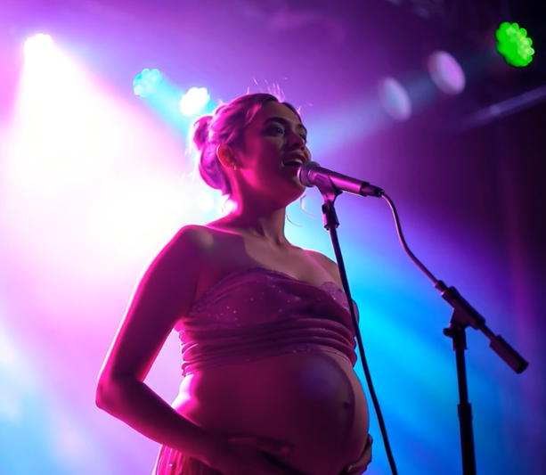 The song spoke of waiting, of love unseen but already known. Of a heartbeat inside her that danced when she laughed, that stilled when she was afraid, and that now pulsed in rhythm with her voice. She was not alone on that stage. She was two souls entwined, singing a duet of life.